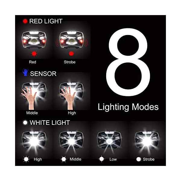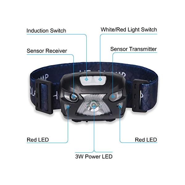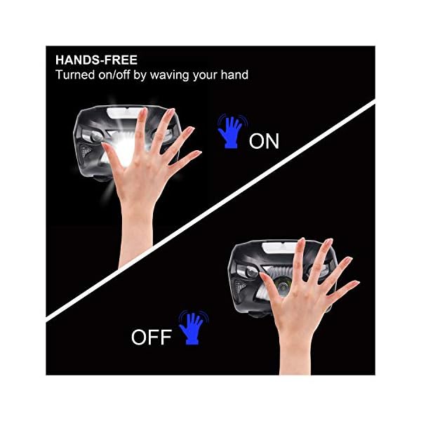 INTERRUTTORE PER IL SENSORE DI MOVIMENTO: Nella modalità di sensore di movimento, la torcia da testa ricaricabile può spegnersi/accendersi con il movimento della mano.