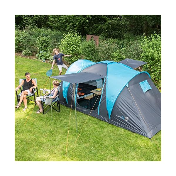 Spaziosa tenda da campeggio per quattro persone. Con due cabine di riposo dotate di zanzariera, per notti senza insetti.